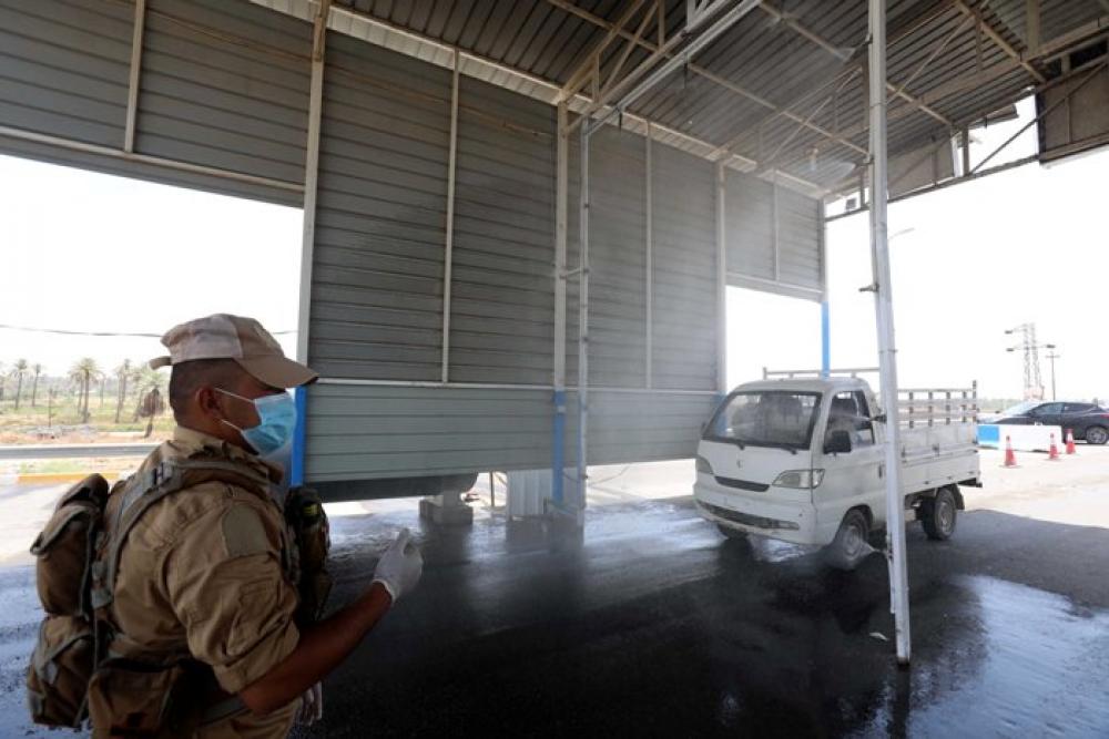 BAGHDAD, June 11 (Xinhua) -- A vehicle goes through disinfection at a checkpoint in Baghdad, Iraq, on June 10, 2020. The Iraqi Health Ministry on Wednesday confirmed 1,146 new cases of COVID-19, raising the total number to 15,414 in the country.
