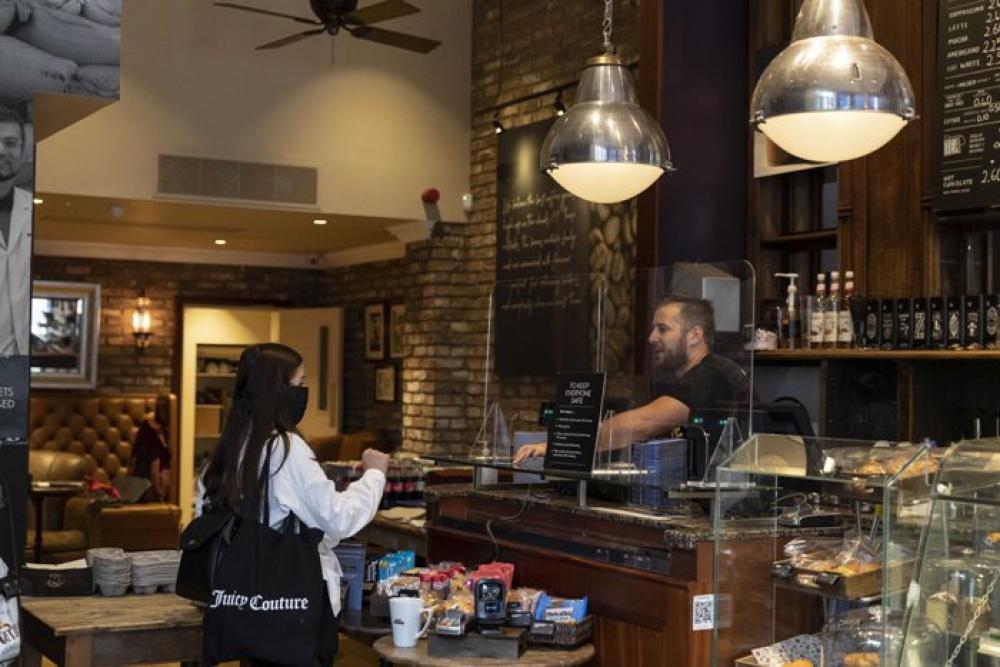 LONDON, June 11 (Xinhua) -- A staff member (R) talks with a customer at a Caffe Nero which reopened for takeaways at Maida Vale in London, Britain on June 10, 2020. Some coffee shops in Britain have reopened for takeaways or deliveries with social distancing rules followed.
