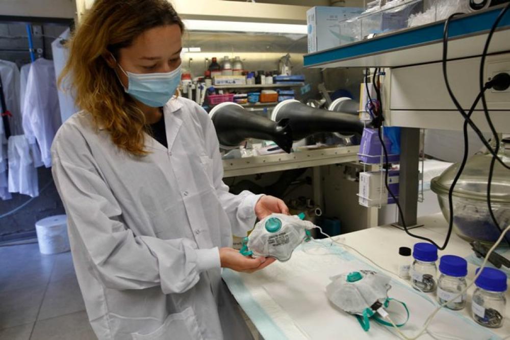 HAIFA, June 17, 2020 (Xinhua) -- An Israeli laboratory worker shows a self-disinfecting, reusable protective face mask at the Technion (Israel Institute of Technology) in northern Israeli city of Haifa on June 15, 2020. Israeli researchers have developed an innovative coronavirus face mask which disinfects itself for multiple use, the Israel Institute of Technology (Technion) said. The mask, developed by Technion researchers, includes an internal layer of carbon fibers, which are homogeneously dispersed within the mask. The disinfection is based on heat produced in the carbon fiber layer using a low two-ampere current, from a standard source such as a portable charger, USB connection or cellular charger.