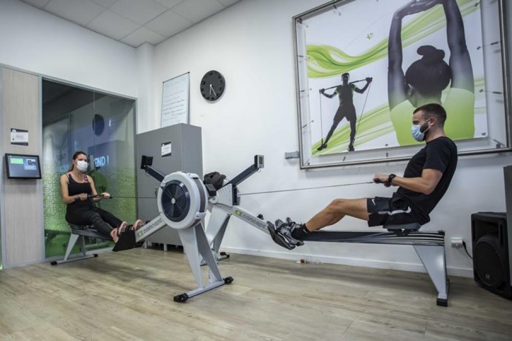 PARIS, June 17, 2020 (Xinhua) -- People work out at a fitness center in Lille, northern France, June 15, 2020. In a televised address to the nation on Sunday, French President Emmanuel Macron declared a first victory over the coronavirus epidemic, announcing a return to normalcy from Monday across French regions, except for overseas territories.
