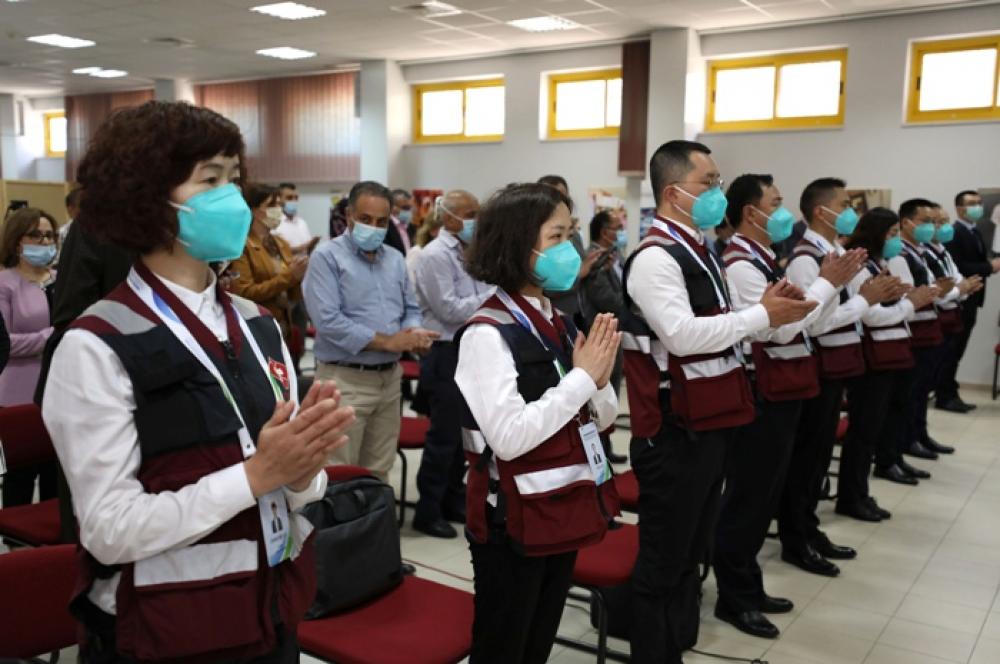 RAMALLAH, June 17, 2020 (Xinhua) -- Members of a Chinese medical team attend a farewell ceremony held for them in the West Bank city of Ramallah, June 16, 2020. The Chinese medical expert team has concluded a mission to support Palestines fight against COVID-19. At a farewell ceremony, Palestinian Health Minister Mai al-Kaila expressed high appreciation for the Chinese experts visit to Palestine. The team, which arrived in Palestine on June 10, was put together by Chinas National Health Commission with the members selected by the Chongqing Municipal Health Commission.