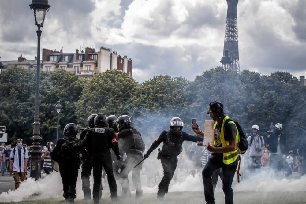 PARIS, June 18 (Xinhua) -- French riot police are seen during clashes with violent fringe groups during a health workers rally in Paris, France, June 16, 2020. Tensions flared at the Invalides Esplanade here on Tuesday, where violent fringe groups hijacked a health workers rally for better work conditions and higher wages. Twenty-four individuals had been arrested by 17:00 local time (1500 GMT), the Paris prefecture said.
