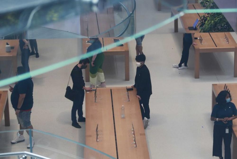 NEW YORK, June 18 (Xinhua) -- Customers and staff workers are seen in an Apple store on Fifth Avenue of New York City, the United States, June 17, 2020. Apple would reopen 10 stores in New York City this week. Its the first time Apple stores in the city have been open since they closed in March in response to the COVID-19 pandemic. The stores in New York City will be open by appointment, meaning that customers can schedule a time to pick up previously purchased products or get services.