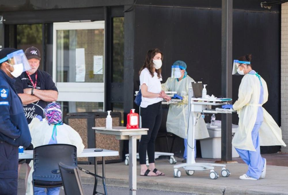 TORONTO, June 19, 2020 (Xinhua) -- People register for testing at a COVID-19 assessment center of a hospital in Toronto, Canada, on June 18, 2020. As of Thursday afternoon, Canada reported 100,148 confirmed COVID-19 cases and 8,299 deaths, according to CTV.
