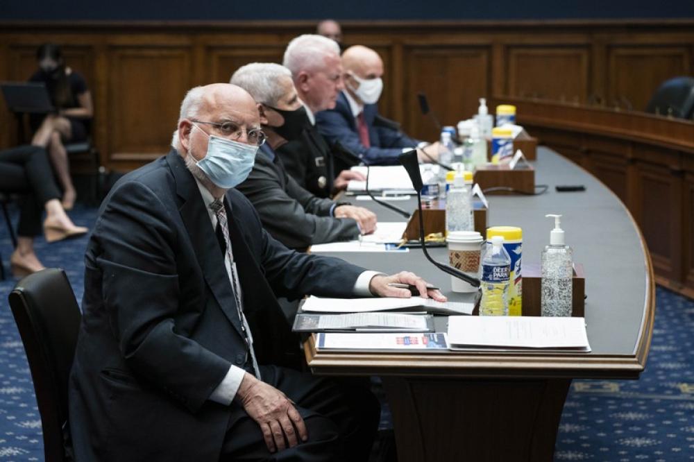 WASHINGTON, June 24, 2020 (Xinhua) -- Robert Redfield (1st L), director of the U.S. Centers for Disease Control and Prevention, prepares to testify before the House Energy and Commerce Committee on Oversight of the Trump Administrations Response to the COVID-19 Pandemic in Washington, D.C., the United States, on June 23, 2020. The U.S. governments top infectious disease expert Anthony Fauci said Tuesday he remains cautiously optimistic that there will be a COVID-19 vaccine at the end of this year or early 2021. He expressed his concern about rising community spread in some states. The next couple of weeks are going to be critical in our ability to address those surges, Fauci said.