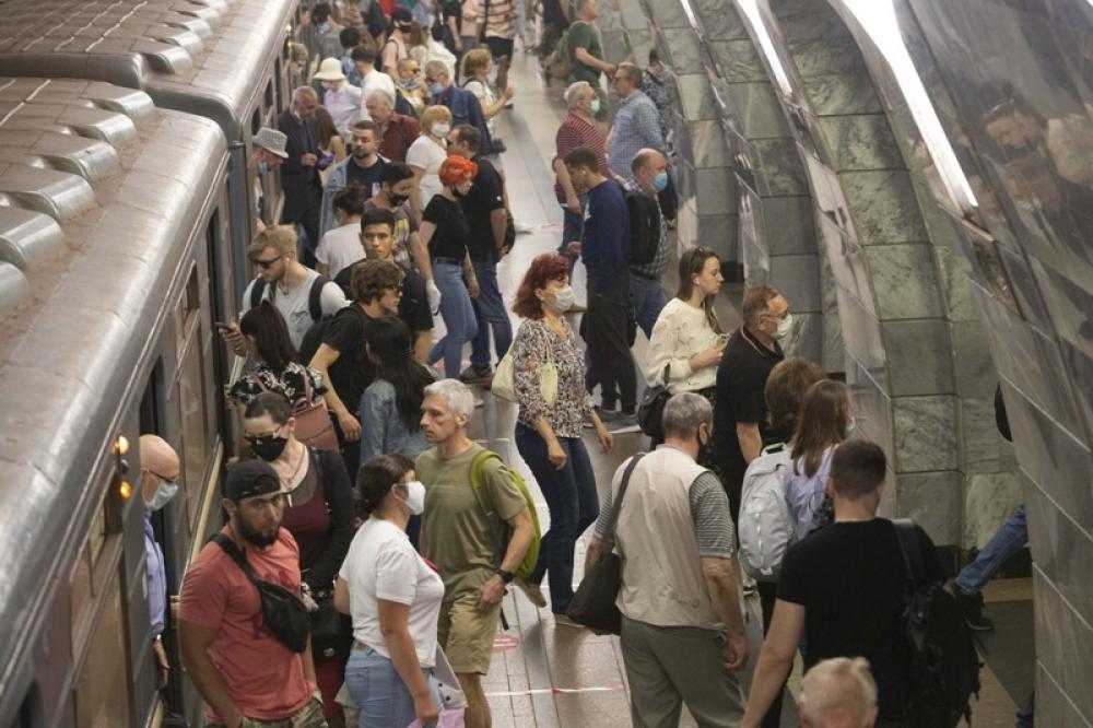 MOSCOW, June 24, 2020 (Xinhua) -- People are seen at a subway station in Moscow, Russia, on June 23, 2020. Russia recorded 7,425 COVID-19 cases in the past 24 hours, taking its total to 599,705, the countrys coronavirus response center said in a statement Tuesday.