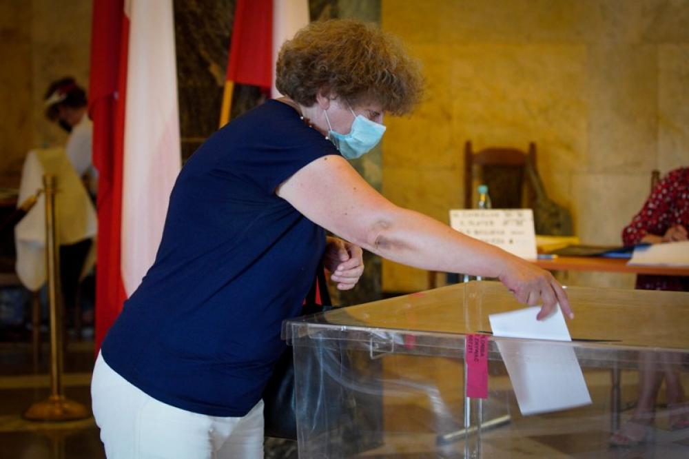 WARSAW, June 29, 2020 (Xinhua) -- A woman casts her ballot at a polling station in Warsaw, Poland, on June 28, 2020. Polling stations have opened on Sunday morning for the first round of the Polish presidential elections, which were expected to take place on May 10 but were delayed by the COVID-19 pandemic. Polands new head of state will be elected in a run-off, exit polls of the first round of presidential elections showed on Sunday evening, Polish Press Agency reported.