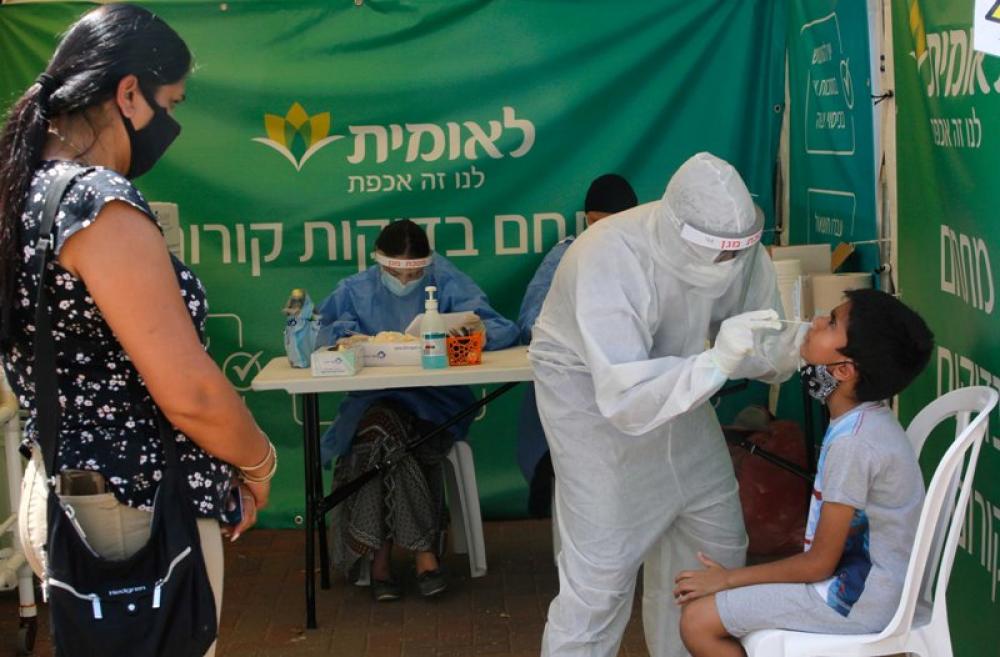 LOD (ISRAEL), July 14 (Xinhua) -- A medical worker collects a swab from a boy for a COVID-19 test in Lod, central Israel, on July 13, 2020. Israels Ministry of Health has reported 1,962 new coronavirus cases on Monday, bringing the total cases to 40,632.