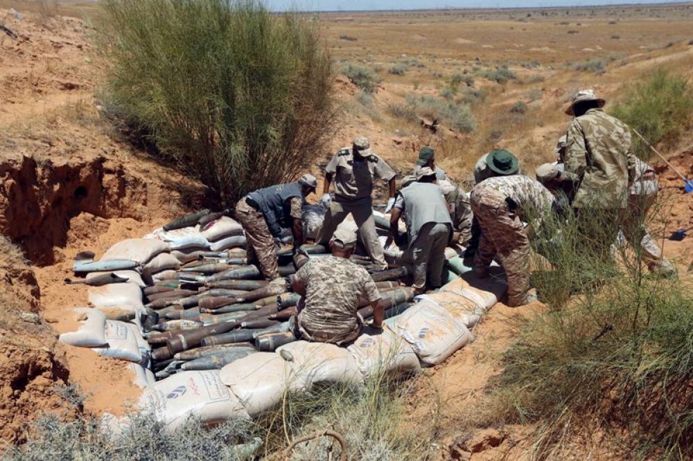 . TRIPOLI, July 23 (Xinhua) -- Fighters of the UN-backed Libyan government arrange explosive remnants in Al-Hira, some 65 km southwest of Tripoli, Libya, on July 22, 2020. Libyas Ministry of Defense of the UN-backed government on Wednesday destroyed large amounts of explosive remnants of war from different conflict areas in the south of Tripoli.