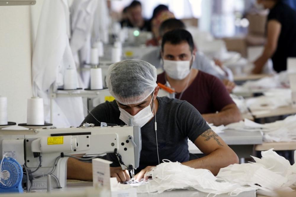 ANKARA, July 27, 2020 (Xinhua) -- Workers make face masks in Ankara, Turkey, on July 26, 2020. Turkeys COVID-19 cases increased by 927 on Sunday, while the total diagnosed cases climbed to 226,100, said Turkish Health Minister Fahrettin Koca.
