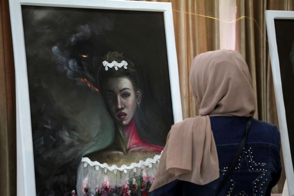 GAZA, Aug. 12, 2020 (Xinhua) -- A woman visits Palestinian artist Kholoud El-Desoukis exhibition, describing the feelings of women in Gaza Strip, in Gaza City, Aug. 11, 2020.
