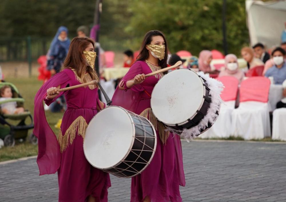 ANKARA, Aug. 24, 2020 (Xinhua) -- Two women wearing masks play drums at a wedding in Ankara, Turkey, Aug. 23, 2020. Turkeys number of COVID-19 cases increased by 1,217 to 258,249 on Sunday, Turkish Health Minister Fahrettin Koca said.
