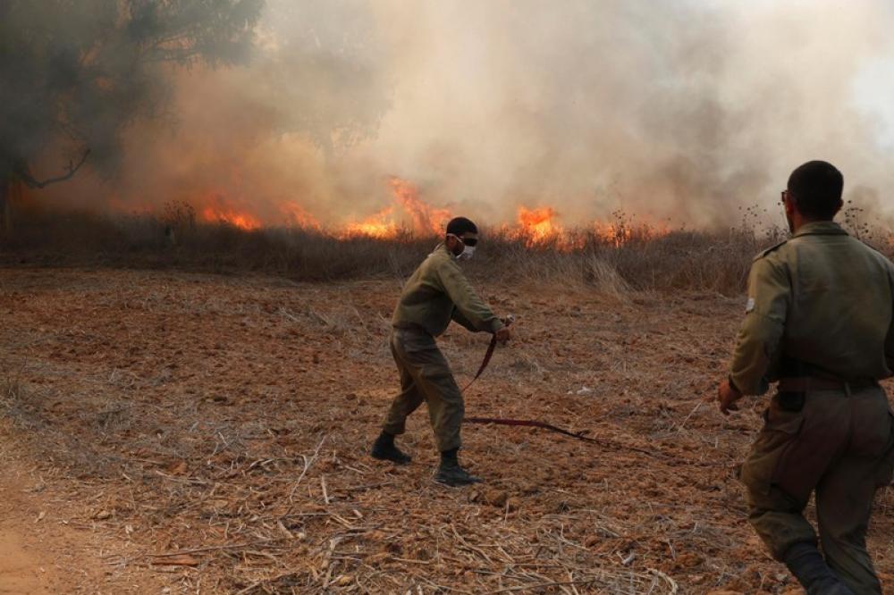 NIR AM, Aug. 24, 2020 (Xinhua) -- Israeli soldiers try to extinguish fire in an area close to the border between Israel and the Gaza Strip near southern Israeli Kibbutz of Nir Am, on Aug. 23, 2020. Since Aug. 6, Gaza has witnessed military tensions with the Israeli army, as the Palestinian youths have been restoring the launch of incendiary balloons toward Israeli cities adjacent to the strip. As a result, Israeli warplanes targeted dozens of military sites belonging to Hamas movement, in response to the launch of arson balloons.