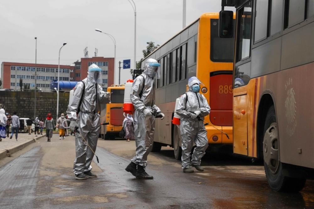 ADDIS ABABA, Aug. 25, 2020 (Xinhua) -- Workers spray disinfectant on a bus in Addis Ababa, capital of Ethiopia, on Aug. 24, 2020. Ethiopias confirmed COVID-19 cases reached 42,143 after 1,472 new COVID-19 positive cases were confirmed on Monday, the countrys Ministry of Health said.