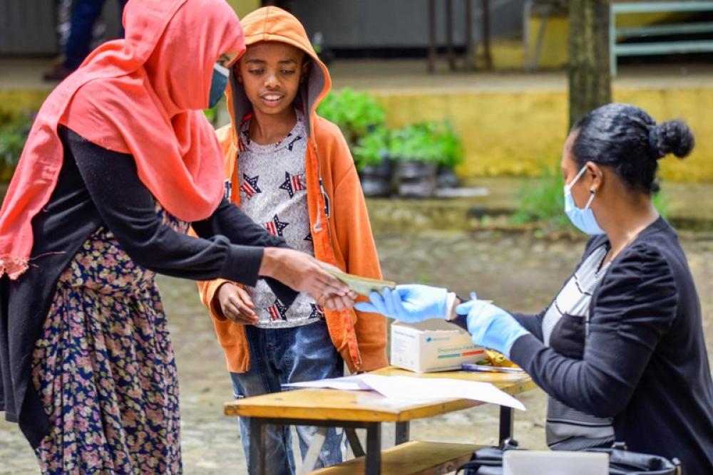 ADDIS ABABA, Aug. 26, 2020 (Xinhua) -- An Ethiopian woman receives aid from China Foundation for Poverty Alleviation in Addis Ababa, capital of Ethiopia, Aug. 25, 2020. The China Foundation for Poverty Alleviation (CFPA) since 2015 has been undertaking activities to help support the most vulnerable sections of Ethiopian society. They include the Smiling Children School Feeding Program, the Panda Pack Project, Water Cellar Project, School Water Purification Project, and Women Economic Empowerment Program in Ethiopia.