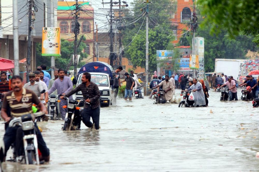 KARACHI, Aug. 26, 2020 (Xinhua) -- Motorcyclists make their way through floodwater after heavy monsoon rain in the southern Pakistani city of Karachi on Aug. 25, 2020. Heavy monsoon rains have broken a 36-year-old downpour record in the month of August in capital city Karachi of Pakistans south Sindh province, Pakistan Meteorological Department (PMD) has said. The heavy rainfall has played havoc in several parts of the city where the rainwater caused flooding, submerging streets, roads, vehicles and low-lying areas. Rain-related accidents including electrocution and roof collapse also claimed lives of four people in the city on Tuesday whereas scores of others got injured.