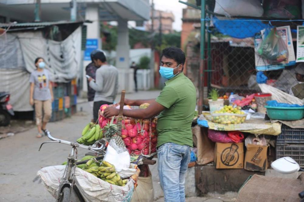 KATHMANDU, Sept. 13, 2020 (Xinhua) -- A fruit vendor wearing a face mask is seen on a street in Kathmandu, Nepal, Sept. 13, 2020. Despite rising cases, the Nepali local administrations in the Kathmandu valley eased restrictions imposed on transport services and business activities starting from Thursday for a week.