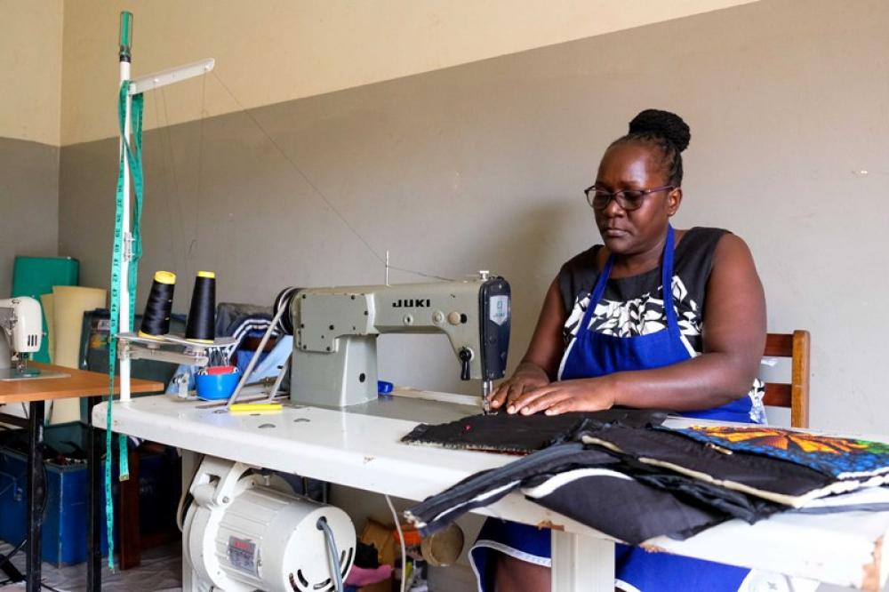 MUKONO, Sept. 14, 2020 (Xinhua) -- Mary Obbo sews a bag at her workshop in Mukono, Uganda, on Sept. 13, 2020. Mary Obbo, a chemistry and biology teacher, decided to start a small tailoring workshop at home to earn a living as schools are closed nationwide amid the COVID-19 pandemic.