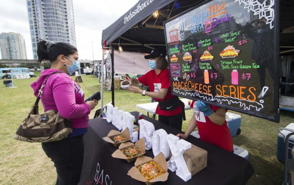 TORONTO, Sept. 13, 2020 (Xinhua) -- A woman (L) wearing a face mask buys food at the 2020 Mac and Cheese Festival in Toronto, Canada, on Sept. 13, 2020. Hosted by Street Eats Market, the festival was held here from Saturday to Sunday amid the COVID-19 pandemic.