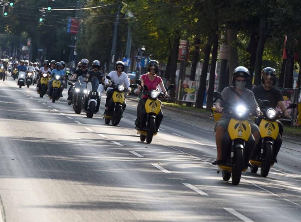 (200913) -- VIENNA, Sept. 13, 2020 (Xinhua) -- People ride electric motor scooters during the parade of electric vehicles in Vienna, Austria, Sept. 13, 2020. Hundreds of electric vehicles took part in the Rock the Ring E-Mobility parade in Vienna on Sunday to promote emission-free, climate-friendly mobility.