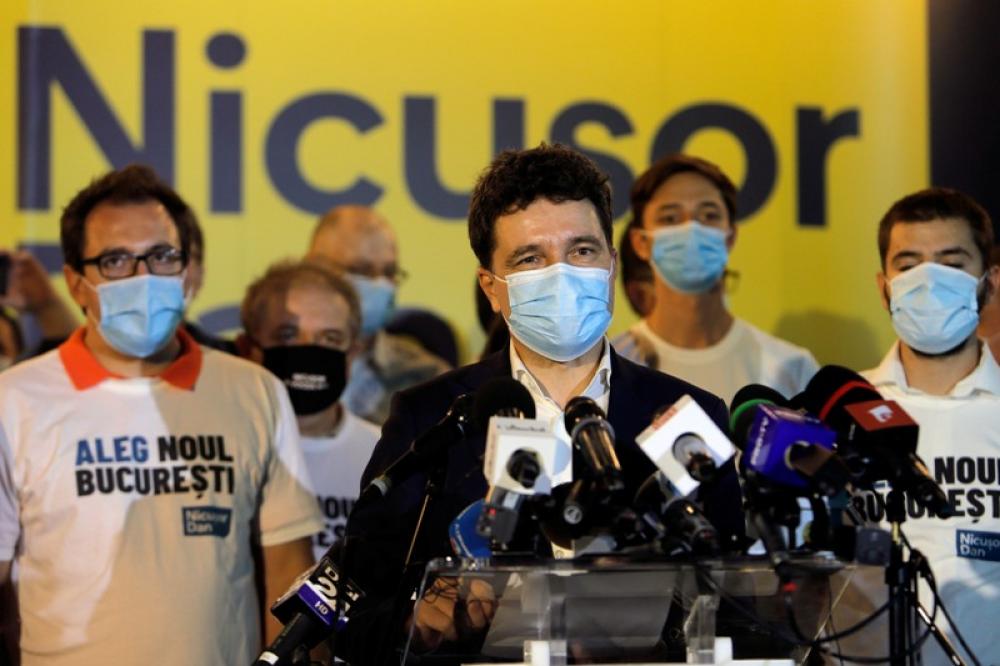.BUCHAREST, Sept. 28, 2020 (Xinhua) -- Independent candidate Nicusor Dan (front) speaks to media after the first exit poll of local elections in Bucharest, Romania, Sept. 27, 2020. Romania held local elections amid the epidemic on Sunday and the exit poll released soon after voting showed that center-right candidates might become the winners of the elections, gaining the posts of mayor of many important cities in the country including the capital.