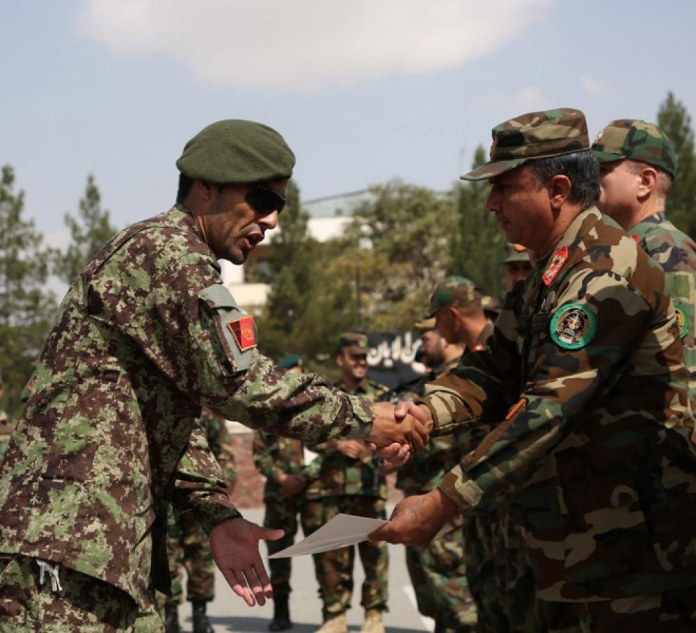 KABUL, Sept. 28, 2020 (Xinhua) -- An Afghan army soldier receives his certificate during the graduation ceremony at Kabul Military Training Center in Kabul, capital of Afghanistan, Sept. 27, 2020. A total of 959 newly graduated soldiers on Sunday joined the Afghan National Army (ANA), boosting the force amid an increase in the Taliban-led unrest, an army source said.