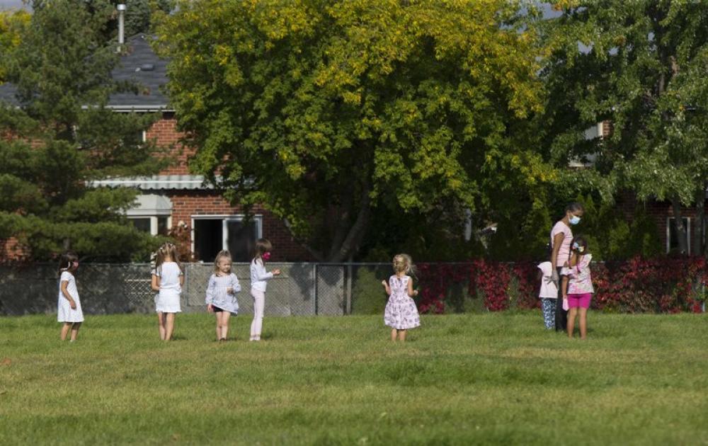 .TORONTO, Sept. 29 (Xinhua) -- A teacher wearing a face mask does an outdoor activity with students at a park in Toronto, Ontario, Canada, on Sept. 28, 2020. The Canadian province of Ontario reported its highest single-day increase since the beginning of the pandemic with 700 cases of COVID-19 announced on Monday.