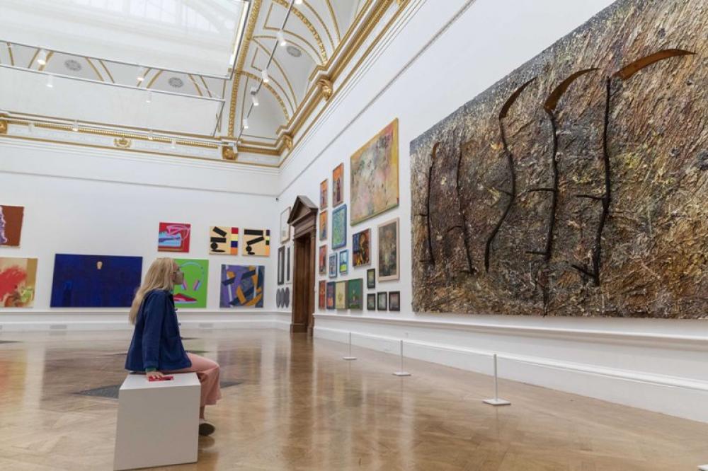 LONDON, Sept. 29 (Xinhua) -- A member of staff looks at exhibits during the preview of the Summer Exhibition at the Royal Academy of Arts in London, Britain, on Sept. 28, 2020. Held every year since 1769, the Royal Academy of Arts Summer Exhibition will take place in autumn for the first time ever due to COVID-19. The exhibition will open to the public from Oct. 6, 2020 to Jan. 3, 2021.
