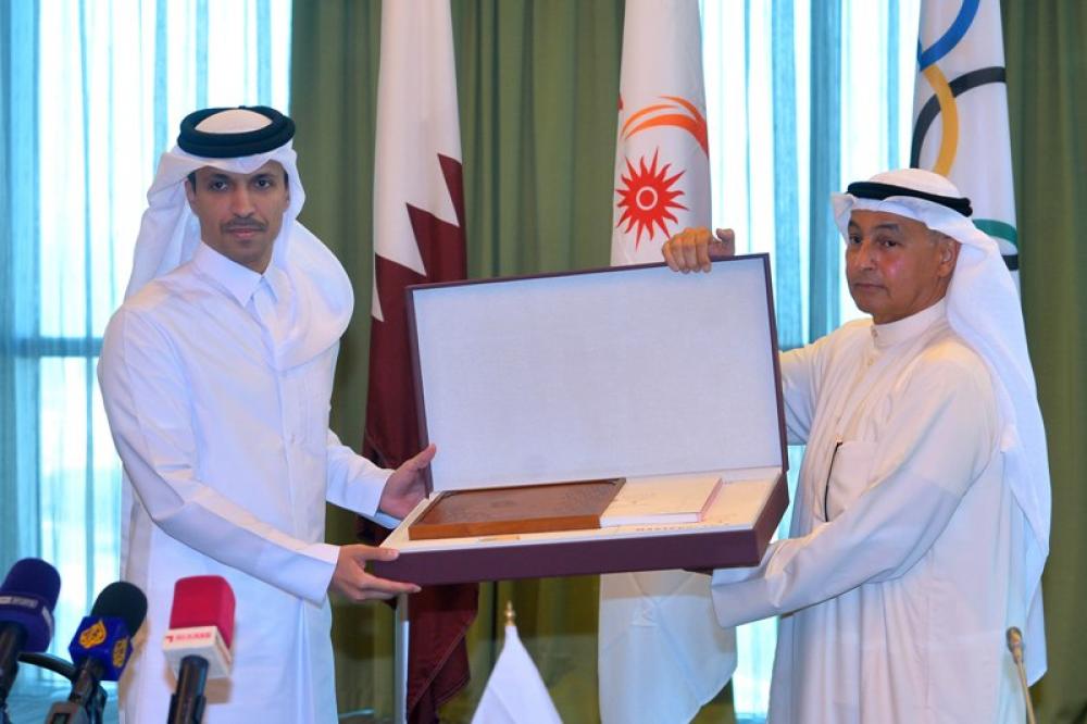 . KUWAIT, Oct. 5, 2020 (Xinhua) -- Secretary-General of Qatar Olympic Committee Jassim bin Rashid Al Buainain (L) submits candidature file for the 2030 Asian Games to the Director General of the Olympic Council of Asia (OCA) Husain Al-Musallam at a press conference in Kuwait City, Kuwait, on Oct. 4, 2020. Qatars Doha 2030 Asian Games bid committee submitted its candidature file to the Olymoic Council of Asia on Sunday.