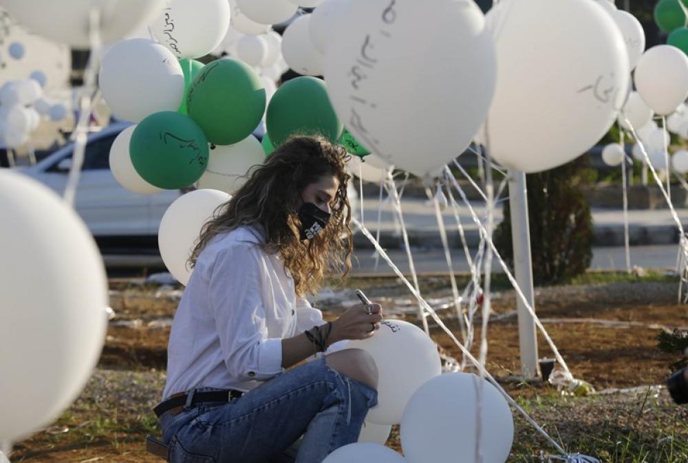 BEIRUT, Oct. 5, 2020 (Xinhua) -- A woman writes victims names on balloons during a ceremony to mark the Aug. 4 port explosions in Beirut, Lebanon, on Oct. 4, 2020. Two explosions rocked Beiruts port on Aug. 4, destroying part of the city while killing around 190 people and wounding at least 6,000 others.