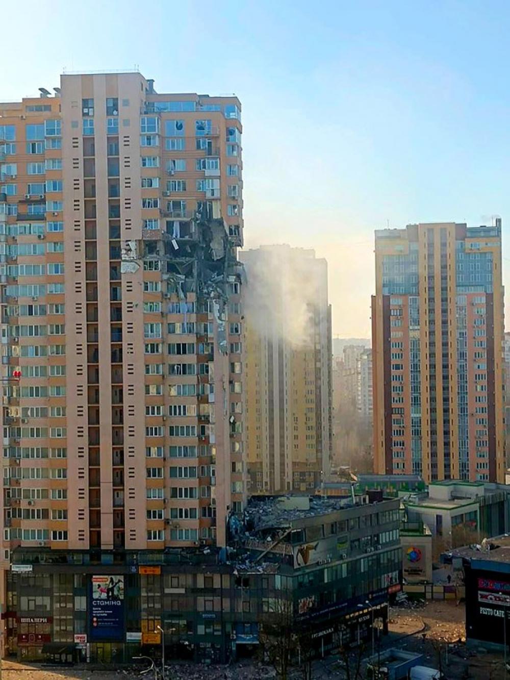 KYIV FEB 26 (UNI):- Smoke billows as a high rise in Kyiv was hit by an aerial weapon on Saturday.