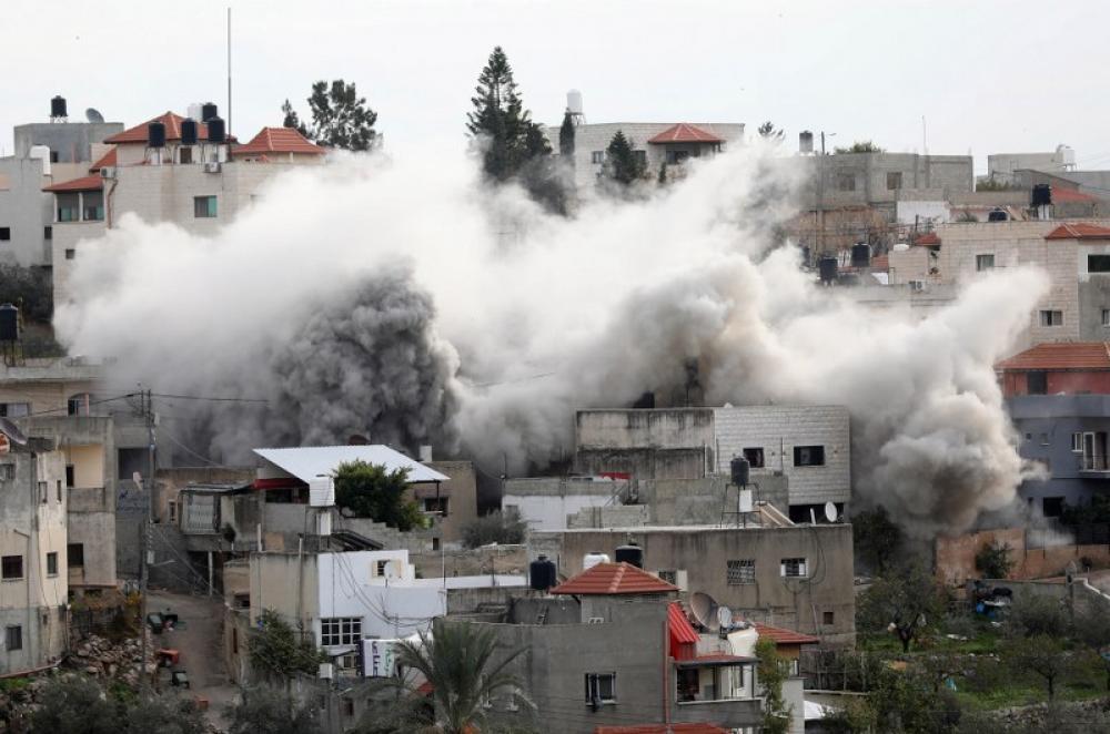 JENIN, Jan. 3, 2023 (UNI/Xinhua) -- Smoke rises as Israeli soldiers demolish a house in the Kufr Dan village, west of the northern West Bank city of Jenin, on Jan. 2, 2023. The Israeli army killed two Palestinians, including a member of an armed group, in clashes in a village in the occupied West Bank early Monday, Palestinian and Israeli sources said. The Israeli military said in a statement that the soldiers entered the Kufr Dan village to demolish the homes of two Palestinian assailants who killed an Israeli military officer in a firefight in September last year.