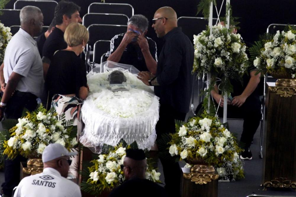 SANTOS, Jan. 3, 2023 (UNI/Xinhua) -- Brazilian soccer legend Pele is seen in his casket at the Vila Belmiro stadium, in Santos, Brazil, on Jan. 2, 2023.