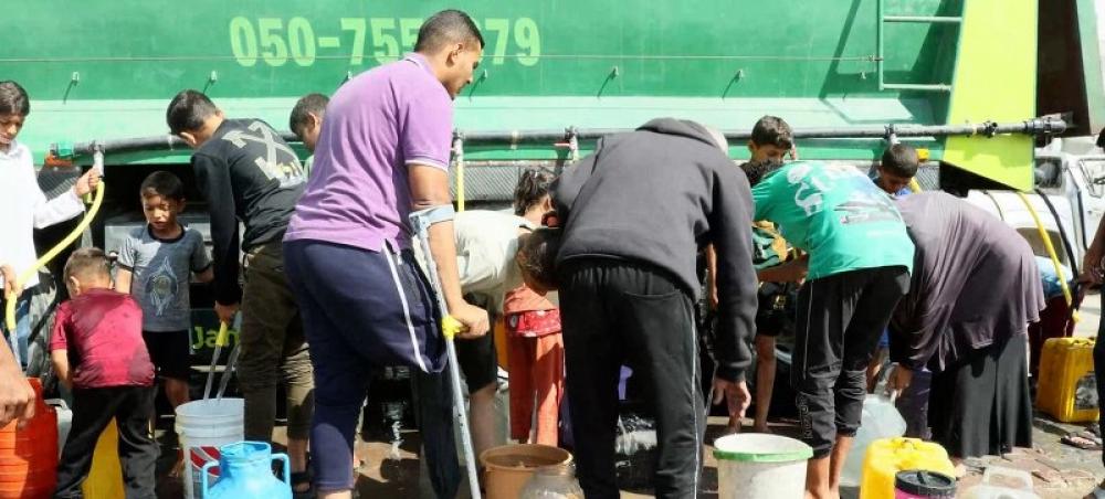 People gather to fill containers with clean water from a UNDP distribution truck in Gaza. Fuel supplies are now critically low, threatening to shut down all aid operations.Photo Courtesy: UN News