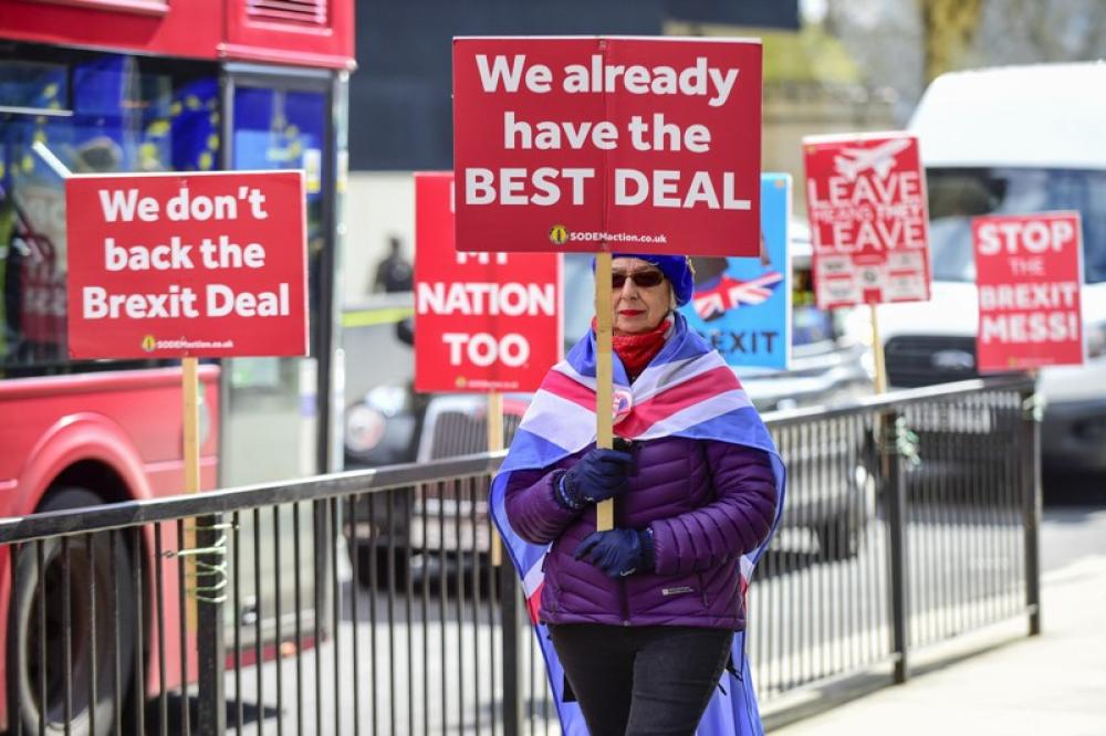 LONDON, March 20, 2019 (Xinhua) -- A demonstrator holds a placard outside the Houses of Parliament in London, Britain, on March 19, 2019. Downing Street confirmed Tuesday that British Prime Minister Theresa May will write to European Council President Donald Tusk asking for Britains departure from the bloc to be delayed.