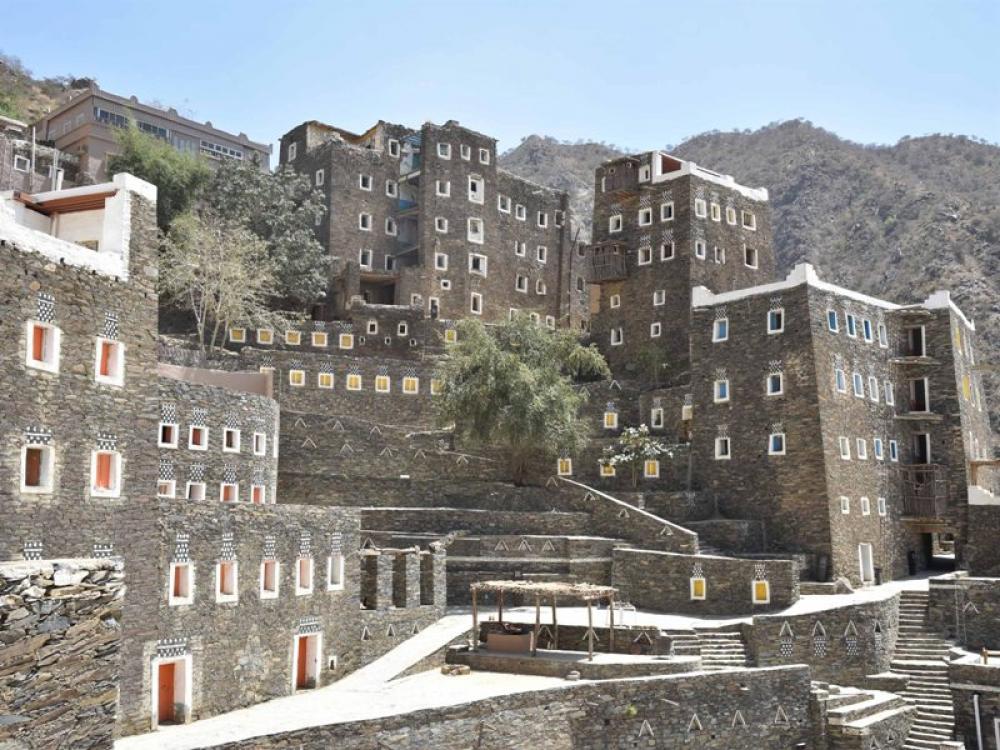 ABHA (SAUDI ARABIA), March 21, 2019 (Xinhua) -- The photo taken on March 20, 2019 shows the Rijal Almaa village, west of Abha city, Asir Province, Saudi Arabia. Rijal Almaa is an ancient village which contains around 60 multiple-story buildings built of stone, clay and wood.