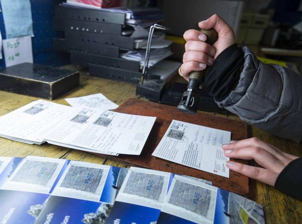 JUNGFRAUJOCH, March 21, 2019 (Xinhua) -- Postcards calling for action against climate change are stamped in Europes highest postbox on the Jungfraujoch peak in Switzerland, on March 20, 2019. Some 900 postcards from youths all over the world were stamped and sent on Wednesday from Europes highest postbox on the Jungfraujoch peak, Switzerland, to global leaders, calling for action against climate change.