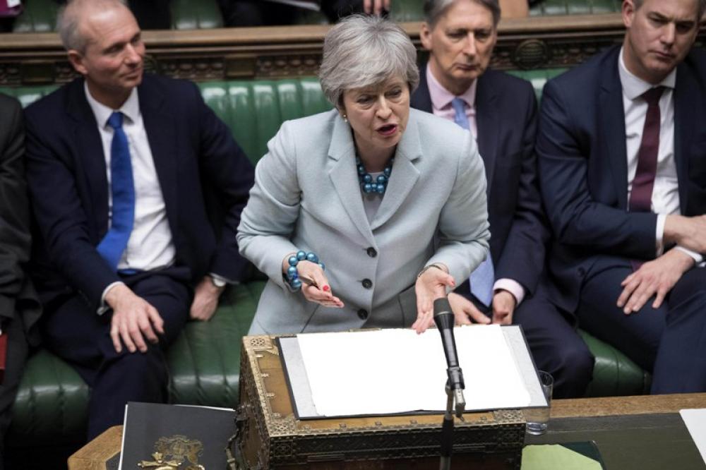 LONDON, March 26, 2019 (Xinhua) -- British Prime Minister Theresa May (Front) is seen during the Prime Ministers statement in the House of Commons in London, Britain, on March 25, 2019. British Prime Minister Theresa May said on Monday that there is still not sufficient support in the House of Commons for a third vote on her Brexit deal.