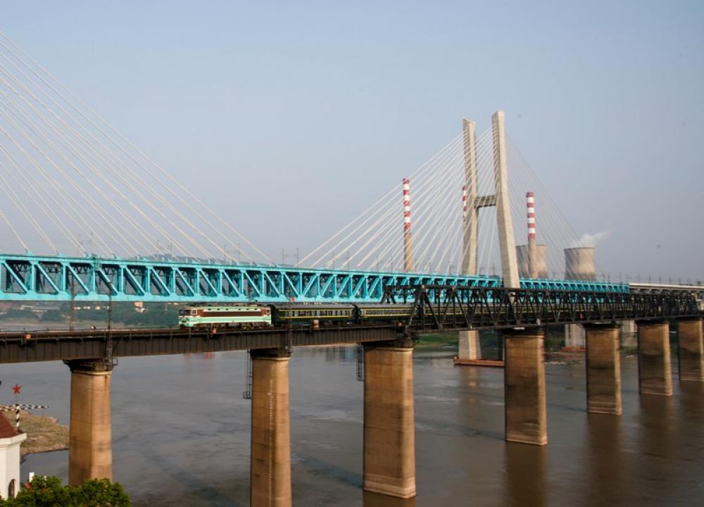 CHONGQING, April 24, 2019 (Xinhua) -- The last train runs on the previous Baishatuo Yangtze River railway bridge in Jiangjin of southwest Chinas Chongqing Municipality, April 23, 2019. The previous Baishatuo Yangtze River railway bridge, completed in 1959, will stop service after April 24. All trains will run on the new double decker steel truss cable stay railway bridge after that day. The new bridge has 4 tracks on the upper deck for passenger trains with a designed speed of 200 kilometers per hour and 2 tracks on the lower deck for cargo trains with the designed speed of 120 kilometers per hour.