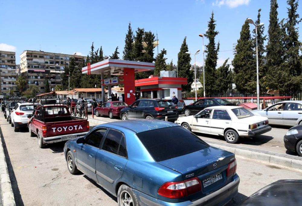 DAMASCUS, April 24, 2019 (Xinhua) -- Syrians line up to fill their cars up with petrol at a gas station in Damascus, Syria, on April 23, 2019. Tens of truckloads of fuel reached the government areas coming from the Kurdish-held region in northeastern Syria amid acute fuel shortage in the country, a war monitor reported on Tuesday. The fuel crisis is the result of the renewed U.S. sanctions on Syria, which were tightened through the latest set of sanctions imposed on the country in March of 2019.