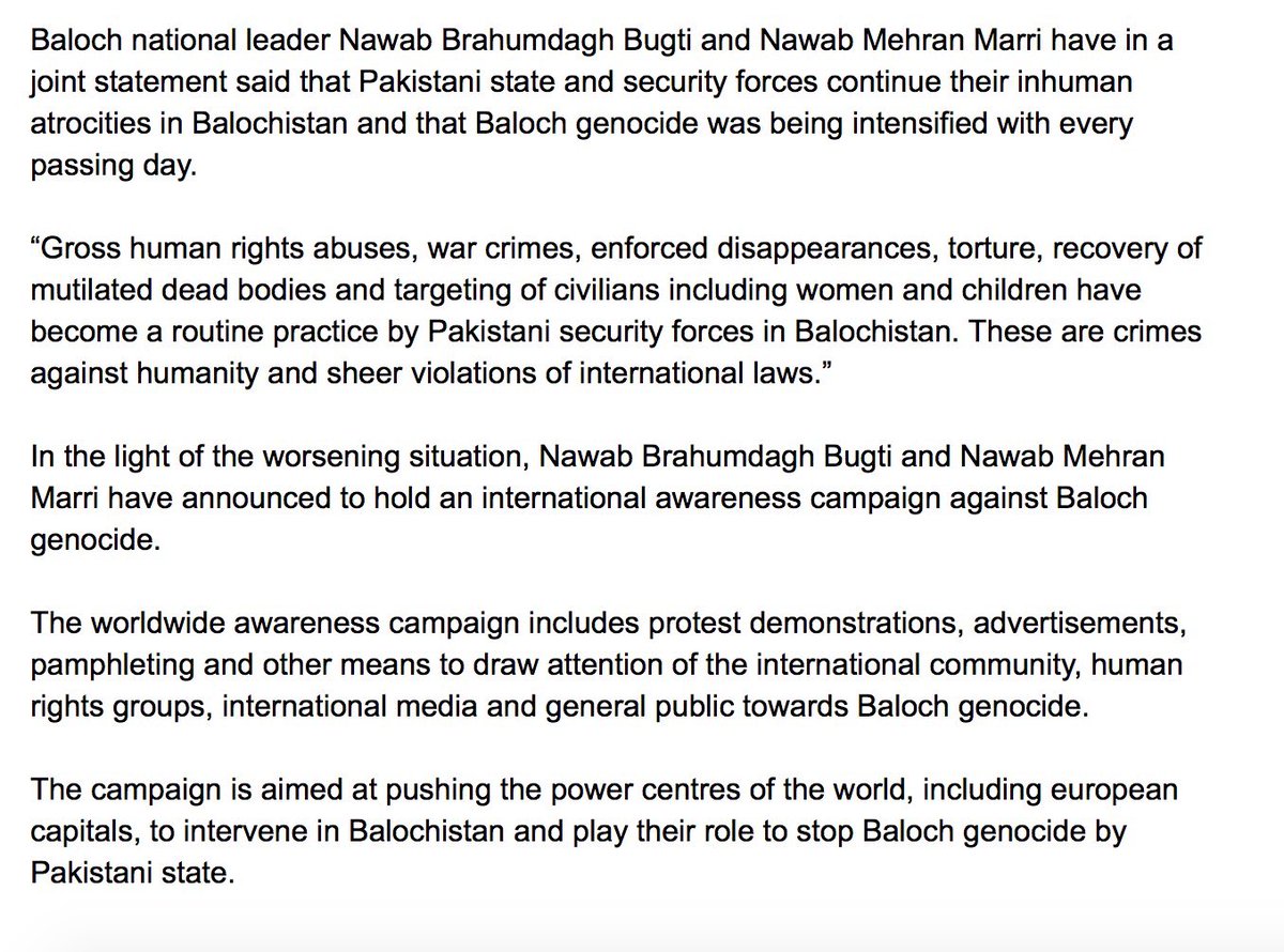 An ensuing paragraph said that both Bugti and Marri will hold international awareness campaign against Baloch genocide.