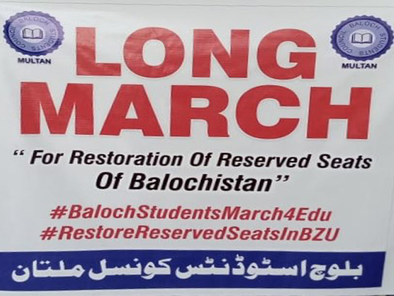 Baloch Students Council Multan tweeted, "After 39-days of Protest Camp Infront of BZU Multan, Baloch students announced to start a long March from Mltan to Isb Via Lhr route for Restoration of Scholarships on reserved seat of Balochistan in BZU and others Uni of Punjab.