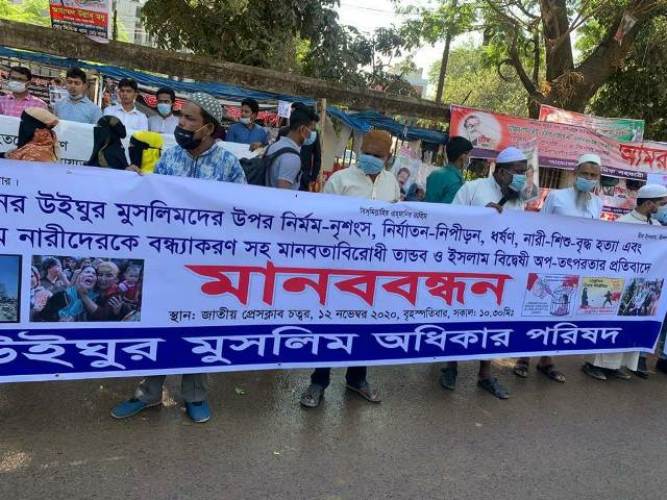 Uyghur Dhaka: A protest rally and human chain was held on Thursday at Dhaka National Press Club by Islamic scholars and Ulemas under the banner of ‘Uyghur Muslim Rights Council’(Uyghur Musalmaner Odhikar Parishad) to demand political and religious rights for the persecuted people in Xinjaing Uyghur Autonomous Region of China.