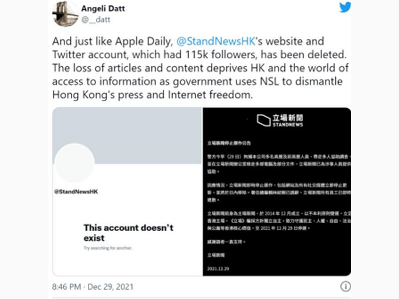 Following the raid, Stand News has ceased all its operations. Stand News was founded in December, 2014 and was a not-for-profit online news portal.
