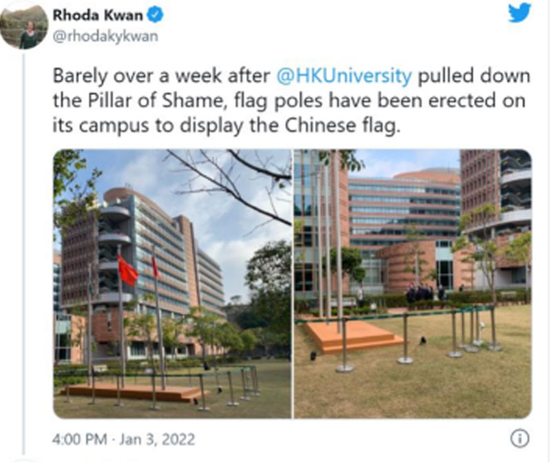 Recently, the memorial for the victims of the Tiananmen massacre, the Pillar of Shame, was removed from the campus of the Hong Kong University.