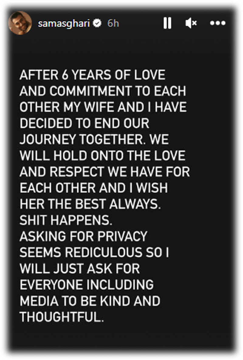 On his Instagram page, Asghari wrote: "After 6 years of love and commitment to each other my wife and I have decided to end our journey together."