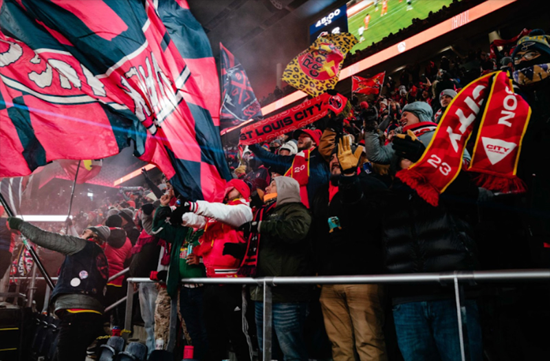 Fans cheer on St. Louis City SC at CityPark in St. Louis, MO. as they play the San Jose Earthquakes on Mar. 18, 2023. PC: Kashaun Smith of St. Louis City SC
