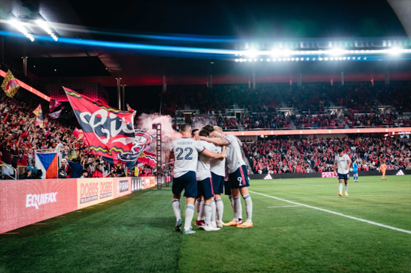 Players of St. Louis City SC celebrate a goal as they defeat FC Cincinnati 5-1 on Apr. 15, 2023 in St. Louis, MO. PC: Kashaun Smith of St. Louis City SC