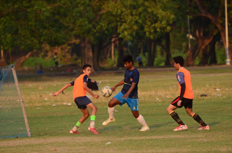 Boys in orange jersey’s preparing to defend the football goal in India's Kolkata. Football is considered a big pastime in India. PC: Avishek Mitra